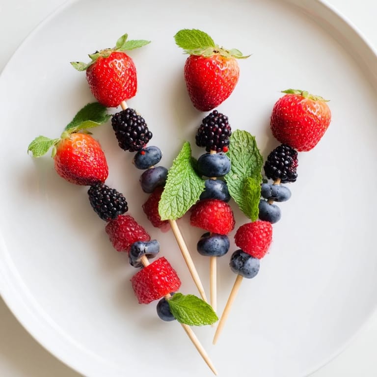 - Thread the berries onto wooden or metal skewers alternating types and adding a mint leaf between every few berries for freshness.