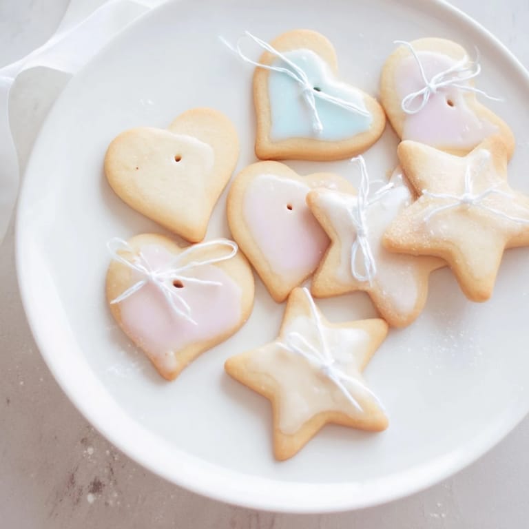 Save to Pinterest Adorable heart and star-shaped cookies tied with ribbons, perfect for gifting or festive occasions. These buttery treats are delicately flavored with vanilla and can be decorated as you wish.