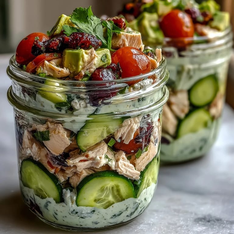 For the best results, use 16 oz mason jars and ensure they are dry before layering. The specific sequence of onion, cucumber, and tomatoes at the bottom acts as a barrier, protecting the chicken and avocado from direct contact with the dressing until you are ready to shake and enjoy.