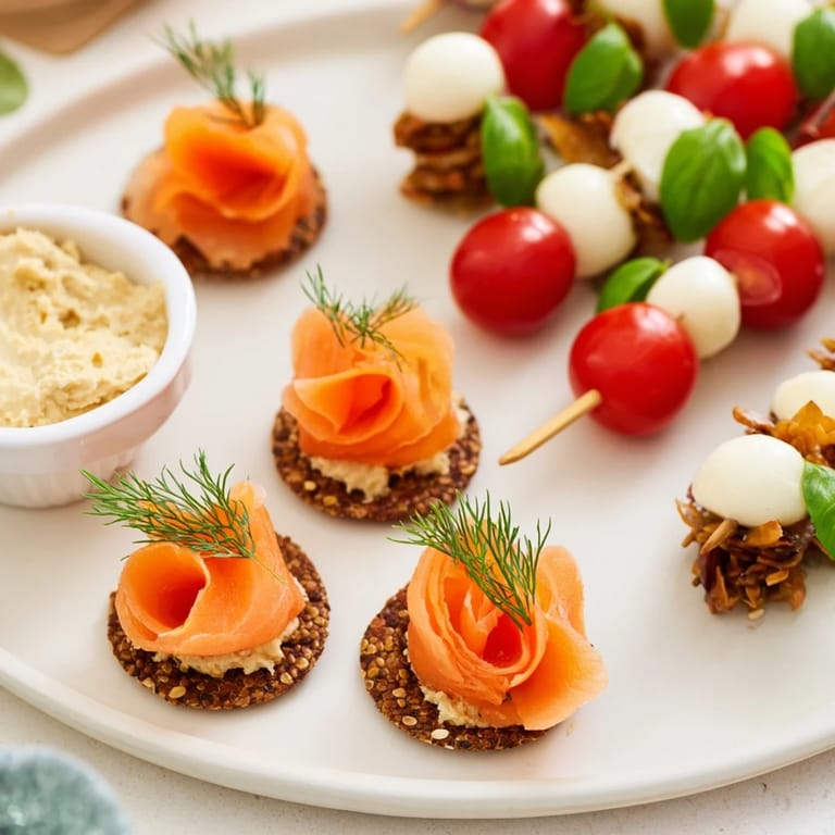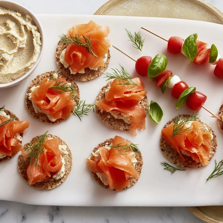 - Savory Bites: 8 mini smoked salmon blinis, 8 mini caprese skewers (cherry tomatoes, mozzarella balls, fresh basil), 8 prosciutto-wrapped asparagus spears, 1 cup marinated olives, 1 cup mixed gourmet nuts, 12 mini gougères (cheese puffs)