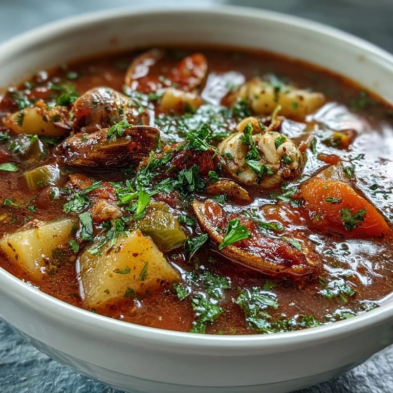 One night I added diced bacon to this chowder on a whim, and it transformed the whole character into something smokier and richer—which taught me that Manhattan clam chowder is flexible enough to adapt to your mood without losing its identity. You can add corn kernels for sweetness, increase the potato ratio for heartiness, or swap red bell pepper for green if you want extra sweetness. The foundation is strong enough that these additions enhance rather than overshadow the clam flavor.