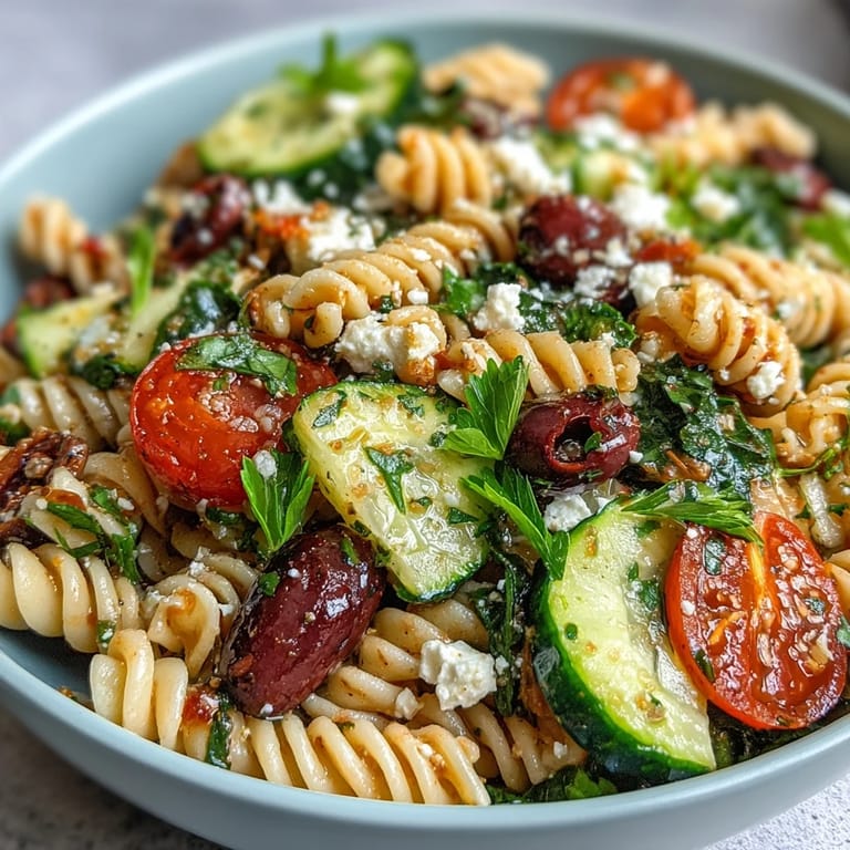 Save to Pinterest There's this moment every summer when the farmers market overwhelms you with color and possibility, and you realize you need a salad that actually tastes like something rather than an obligation. That's when this Greek pasta salad found its way into my rotation—not from a cookbook, but from standing in my kitchen at dusk with an armful of bell peppers and cherry tomatoes, wondering how to make something light feel substantial. The whole grain pasta was the revelation; it holds up to the dressing without turning mushy, and somehow it tastes better the next day when the flavors have gotten to know each other.